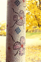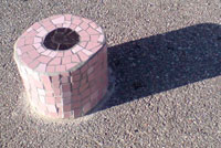 | Mosaikgodis 17 st godisbitar i lecablock och klinkers runt 2 rödekar. Elevmedverkan Svartbäcksskolan Haninge Kommun 2008-2009 |