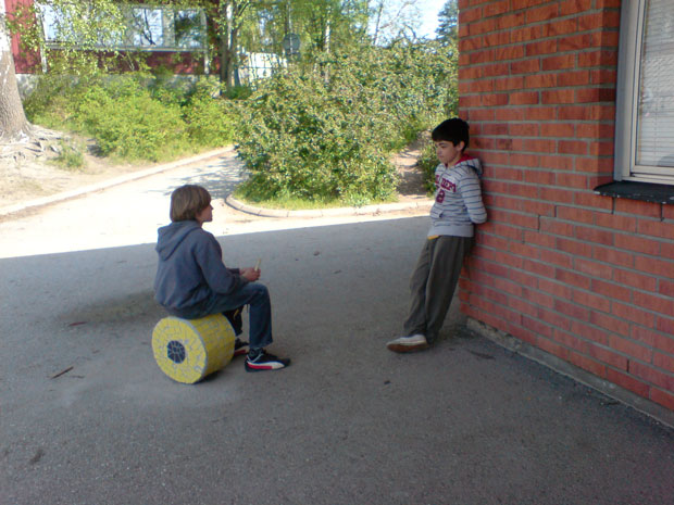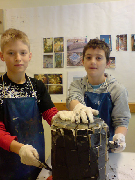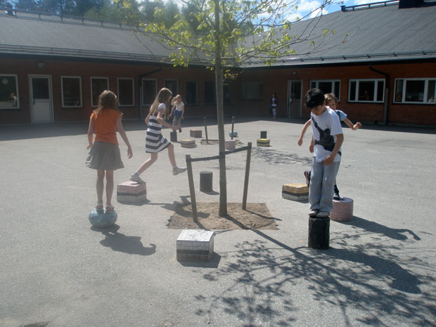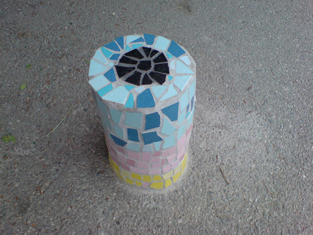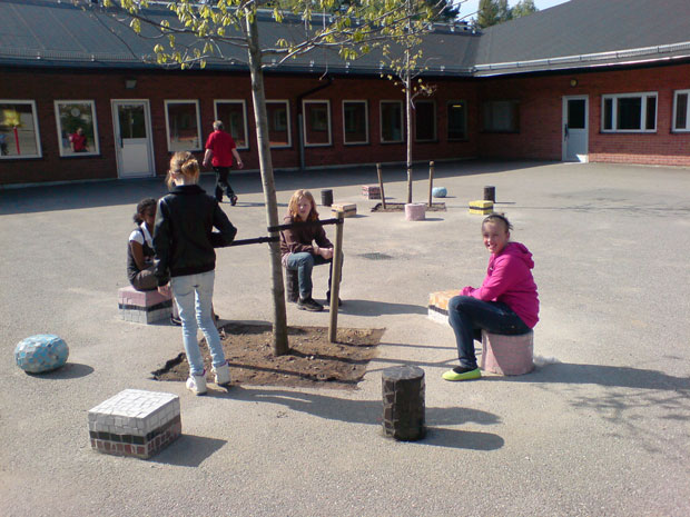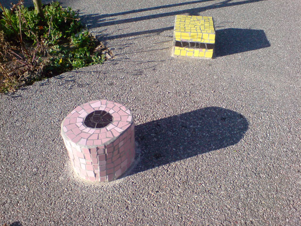 Mosaikgodis17 st godisbitar i lecablock och klinkers runt 2 rödekar. Elevmedverkan Svartbäcksskolan Haninge Kommun 2008-2009